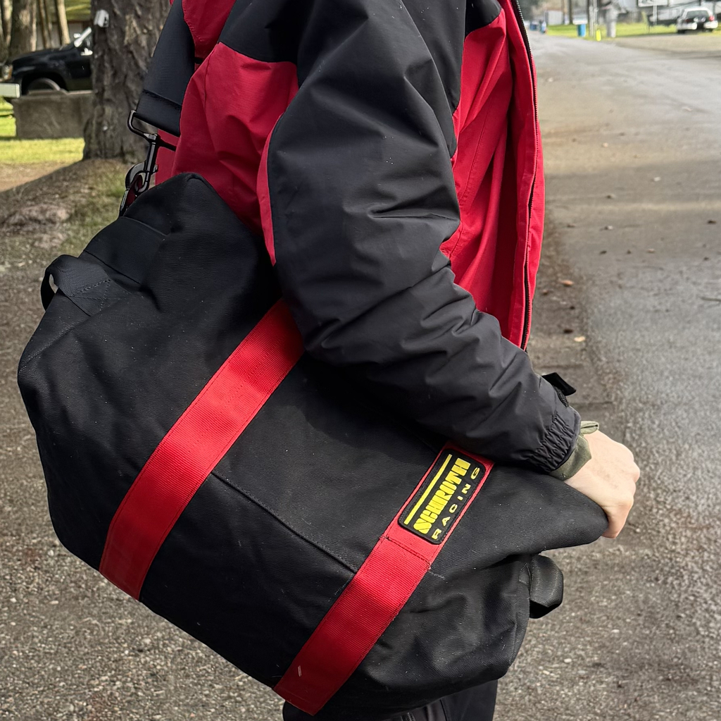 🚘 The Track Bag - heavy duty & durable, track day-ready, and designed with a nod to sustainability using upcycled expired racing harnesses.